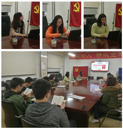 随后,根据事先部署,由三位同学分别从新党章、十九大报告、十九大以来的新发展新变化三个方面向大家做分享。付佳倩同学首先从党章的功能和定位、基本架构、主要内容入手,逐字逐句重点介绍了十九大对党章的十项重要修改。段思竹同学具体解读了十九大报告,她将报告分为“过去五年的工作与历史变革”、“中国特色社会主义进入新时代”和“未来的发展之路”三个方面,逐项为同学们介绍报告内容与自己的心得感悟,并借用习近平总书记报告中的原文“青年兴则国兴”作结,鼓舞同学们要尽力完成本职,践行个人小梦,如此汇聚的中国梦才会灿若星空。最后由姜嘉琪同学整体介绍十九大以来的新发展新变化,她以“新时代”“新思想”“新矛盾”“新目标”四个方面入手分享学习感悟,并通过列举十九大召开以来各市、各高校进行宣传、学习、贯彻的实例,展现全国上下学习十九大的热潮。