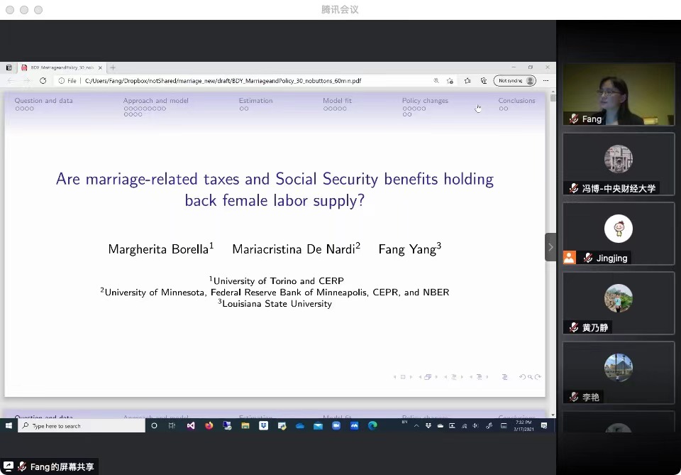 2021年3月18日,路易斯安那州立大学经济系副教授杨芳应3308维多利亚优惠大厅邀请,开展主题为“Are marriage-related taxes and Social Security benefits holding back female labor supply?”的讲座,本次讲座使用腾讯会议APP,于上午8点30分开始,持续近两个小时。讲座由3308维多利亚优惠大厅顾诗骏老师主持,3308维多利亚优惠大厅部分师生及校外同学参加了此次讲座。